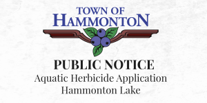 Public Notice to inform all residents of the following lake and surrounding areas that aquatic herbicide applications may take place between June 18, 2024 and July 18, 2024 depending on weed growth and various limnological conditions. Hammonton Lake: Applications of one or more of the following herbicides/algaecides: Tribune (diquat dibromide) work will be conducted by boat with herbicide application spray equipment by Lake Management Sciences, Inc. PO Box 2395 Branchville, N.J. 07826 registration number 91726B. For information contact Chris Hanlon (973) 948-0107.